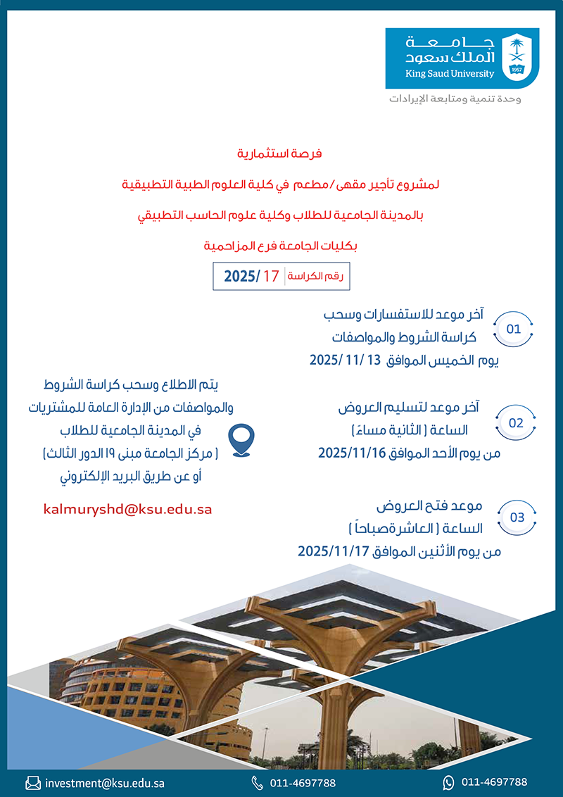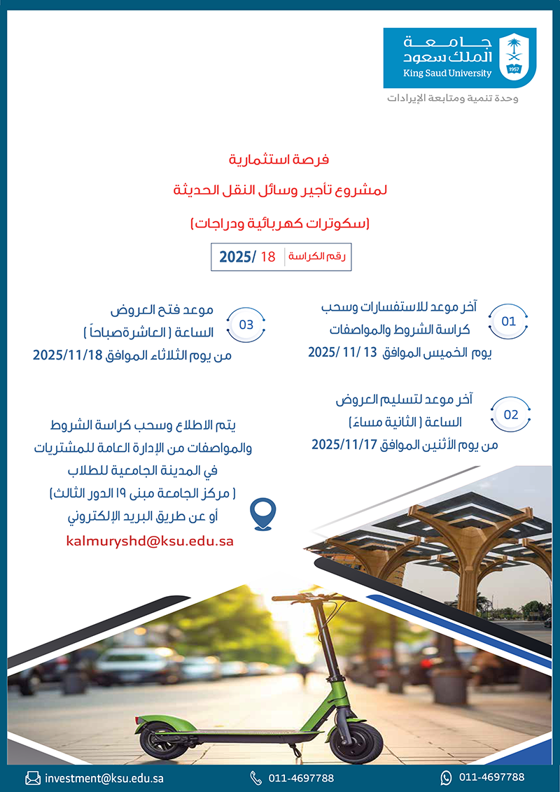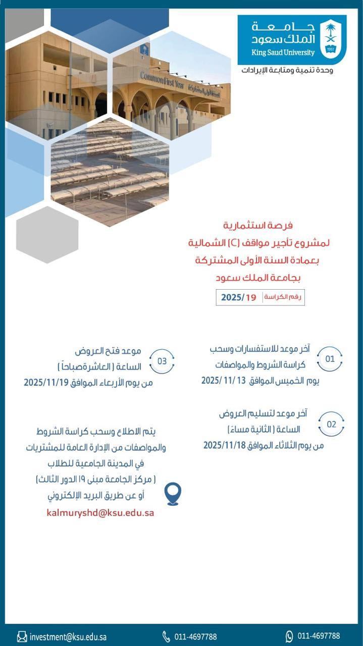 - فرصة استثمارية رقم (2025/19) لمشروع تأجير مواقف(C) الشمالية بعمادة السنة الأولى المشتركة بجامعة الملك سعود.