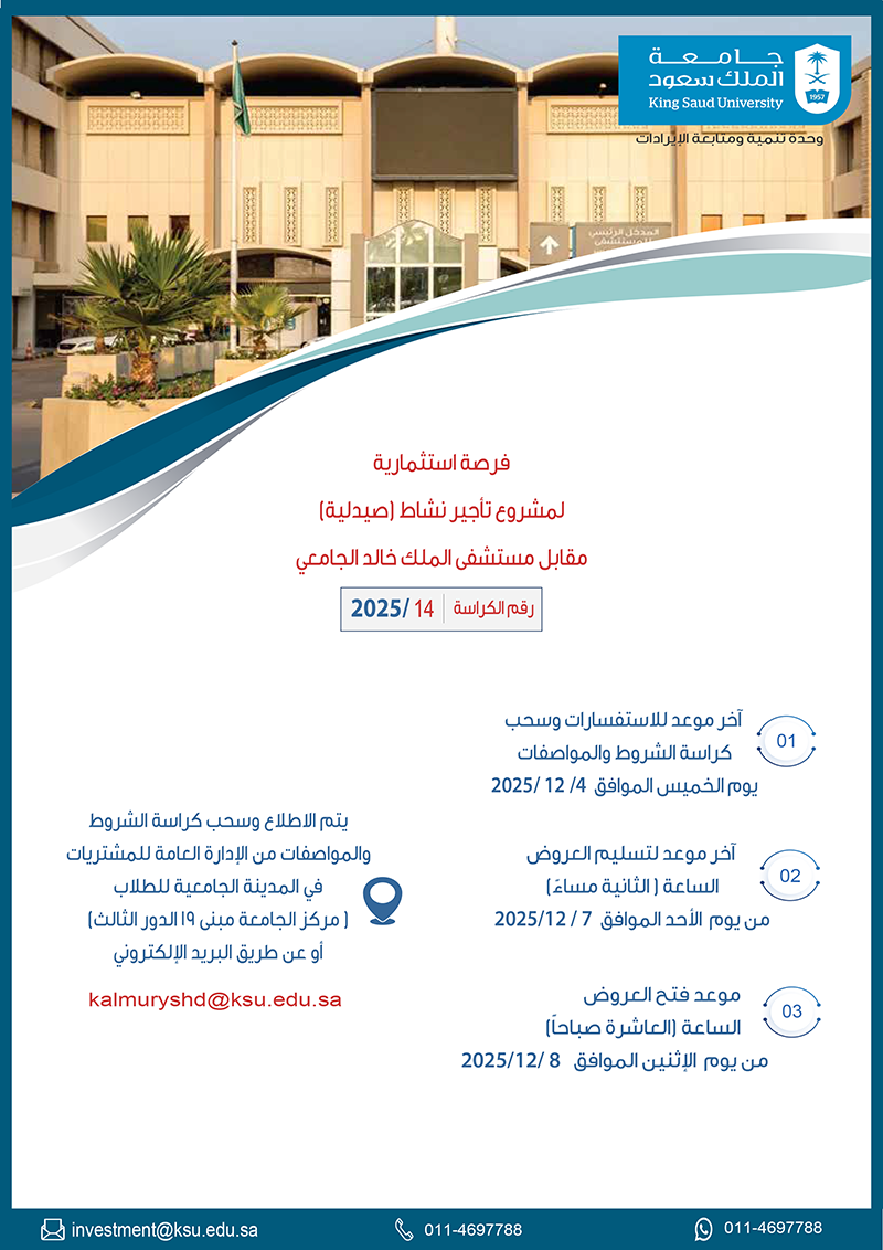- فرصة استثمارية رقم (2025/14) لمشروع تأجير نشاط (صيدلية) مقابل مستشفى الملك خالد الجامعي
