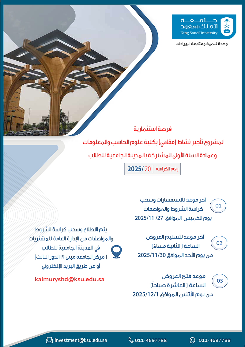 - فرصة تأجير استثمارية رقم (2025/20) لمشروع نشاط (مقاهي) بكلية علوم الحاسب والمعلومات وعمادة السنة الأولى المشتركة بالمدينة الجامعية للطلاب