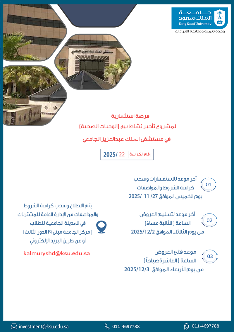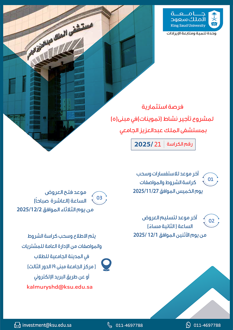 - فرصة تأجير استثمارية رقم (2025/21) لنشاط (تموينات) في مبنى (5) بمستشفى الملك عبدالعزيز الجامعي.